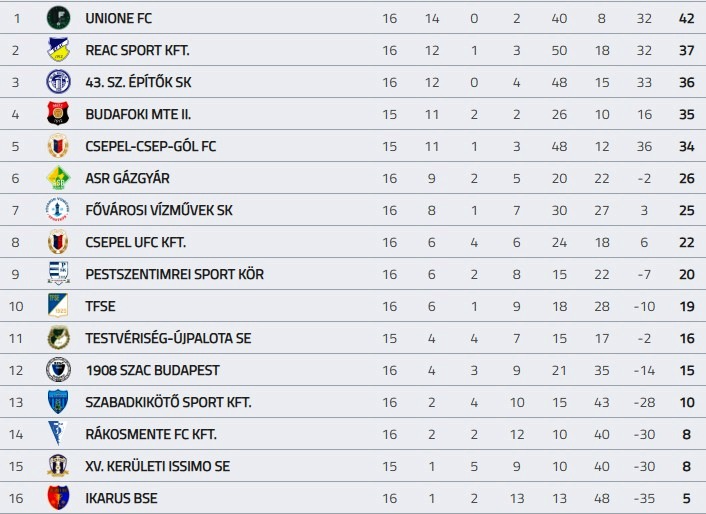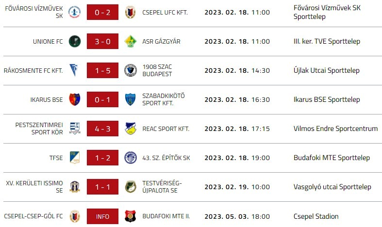 Az első helyért szintén versenyben lévő csapatok rangadóját a Budafok-Csepel-Csep-gól mérkőzést elhalasztották.