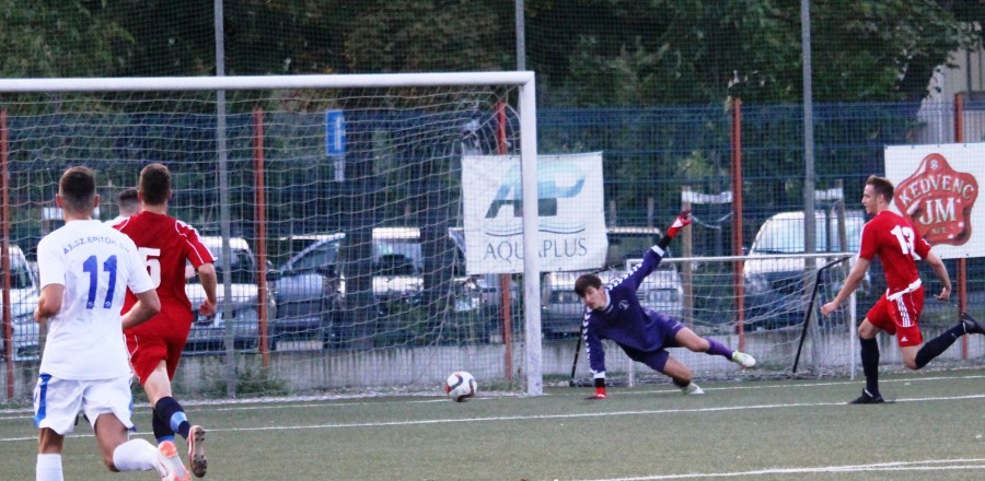 43---viz-mj-08A 10. percben Demeter egy félpályán eladott labda után nem ért vissza, a helyére bejátszott labdával, gyors jobb oldali vendég akció végén Köböl 15 méterről lőhetett a kapunkra, a labda a rövid felső léc tetejét súrolva hagyta el a játékteret! A kirúgás után már vezettünk is. Mészáros csent el egy átadást a vendég térfél közepén, kicselezte (kikerülte) a védőjét a jobb oldalon, majd egészen az alapvonal és az ötös találkozásáig vezette a labdát, innen higgadtan a középen tisztán helyezkedő Vécsihez játszott, aki pár lépésről az üres kapuba pofozta a labdát 1:0.